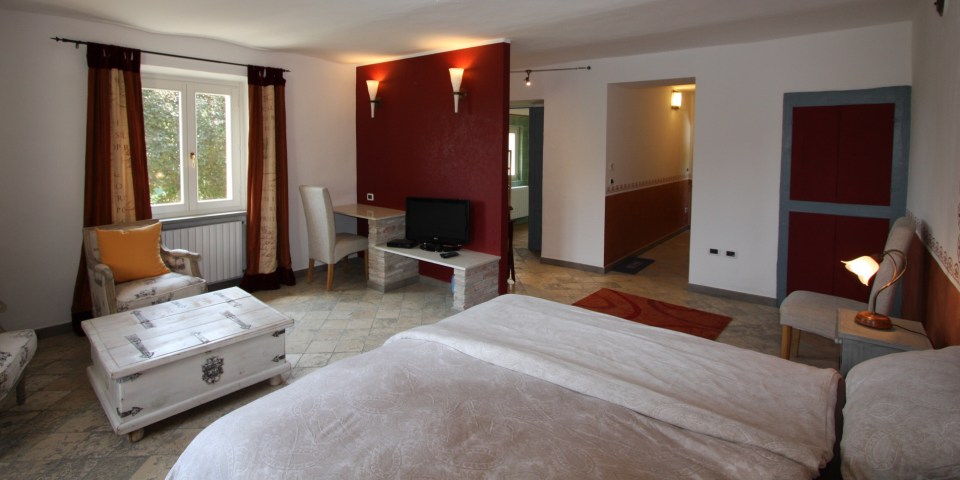 Eine Treppe führt vom Hofplatz in den ersten Stock, wo sich zwei Gästesuiten befinden. Beide Suiten schauen nach Süden, haben viel Licht und eine schöne Aussicht und verfügen je über ein grosszügiges Bad und einen Tagesbereich.
