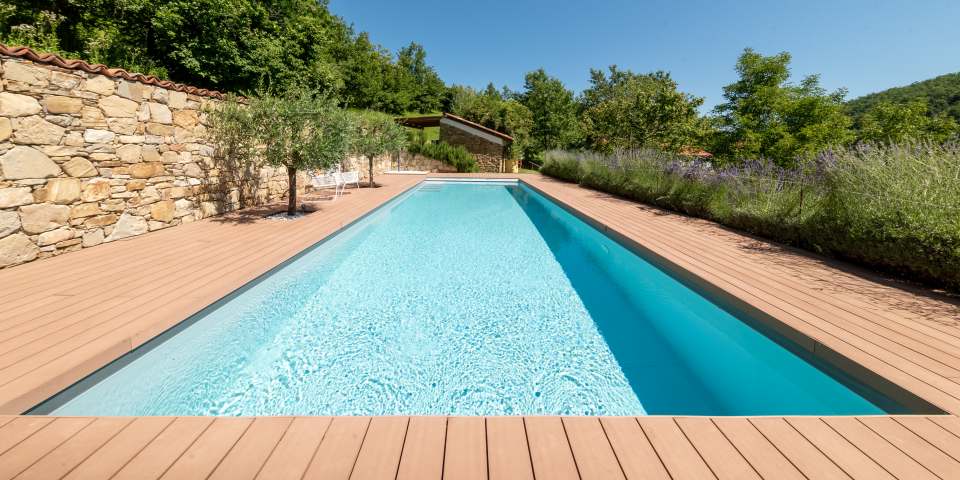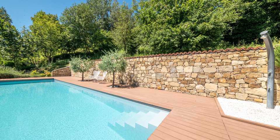 Am Ende des Gartens und etwas höher gelegen, befindet sich der 2016 neu gebaute Swimmingpool (4 x 12m) mit einer grossen Sonnenterrasse, Aussendusche und wunderschöner Aussicht. Der Pool verfügt über eine Salzwasser-Aufbereitungsanlage, ist beheizbar mit Gegenstromanlage und die Abdeckung ist elektrisch. Die Pooltechnik ist in einem eigenen, kleinen Gebäude untergebracht.
