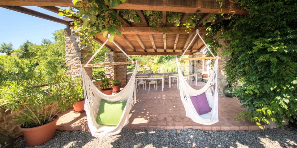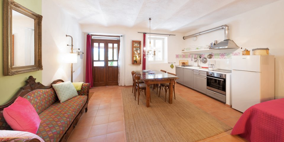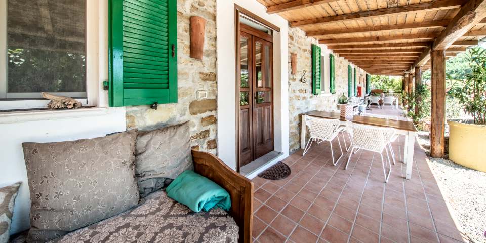 Alle 5 Ferienwohnungen im Gästehaus sind für jeweils 2 bis 4 Personen ausgestattet, verfügen über eine eigene Küche mit Glaskeramikherd und Backofen und haben einen eigenen Aussensitzplatz. Im Gästehaus befinden sich zusätzlich eine moderne Edelstahl-Gastroküche für Kochkurse oder Gruppenbuchungen, ein grosser Allzweckraum für Seminare, Yoga, Massagen etc. mit eigenem Bad, ein grosser Essraum für bis zu 18 Personen, ein Abstellraum und entlang der Südseite des Gebäudes und vom Innenhof zugänglich, gibt es eine grosse Sitzlounge aus Stein sowie eine überdachte und von Kiwibäumen bewachsene Pergola mit Esstischen, zur allgemeinen Nutzung. Das Gästehaus wird auch in seiner Gesamtheit an Gruppen vermietet. Das separate Ferienhäuschen (Gästewohnung 6) bietet Wohnen auf 2 Etagen für 3 Personen und hat einen privaten Balkon mit Ess- und Sonnenbereich.