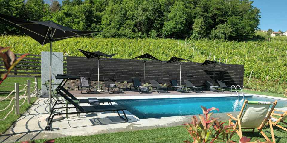 Der Besitz umfaßt insgesamt ca. 4,3 Ha arrondierte Grundstücke – knapp 3 Ha davon sind bestens gepflegte DOC Weinberge. Die übrigen Gründe inkludieren die Gebäude, einen grossen Hofplatz, einen gepflegten Garten mit grosszügigem Sitzbereich, einen Swimmingpool mit einer Sonnenterrasse, Wiesen mit Obstbäumen und etwas Wald. Von einer kleinen, wenig befahrenen Nebenstraße führt ein automatisches Tor und eine Auffahrt zu einem großen Vorplatz mit Parkmöglichkeiten und zu den Gebäuden.