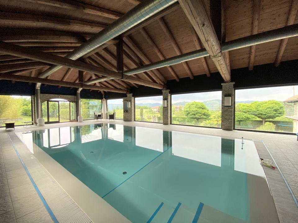 Vom Erdgeschoß führt der Personenlift nicht nur zu den Schlafzimmern im ersten Stock sondern auch zum Hallenbad und somit ist dieses für alle Bewohner bequem erreichbar. Der Pool ist ein absolutes Highlight: er misst 5 x 10 Meter, ist bündig mit der umgebenden und beheizbaren Bodenfläche angelegt und die riesigen Panoramafenster geben viel Licht und Aussicht auf den Garten und die Landschaft. Eine grosse Glastüre führt auf eine Rasenfläche seitlich des Gebäudes und somit ist der Pool im Sommer auch vom Garten her gut zugänglich.
