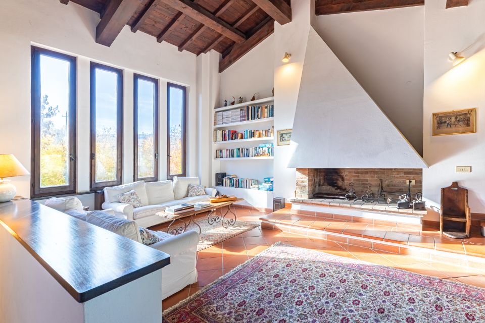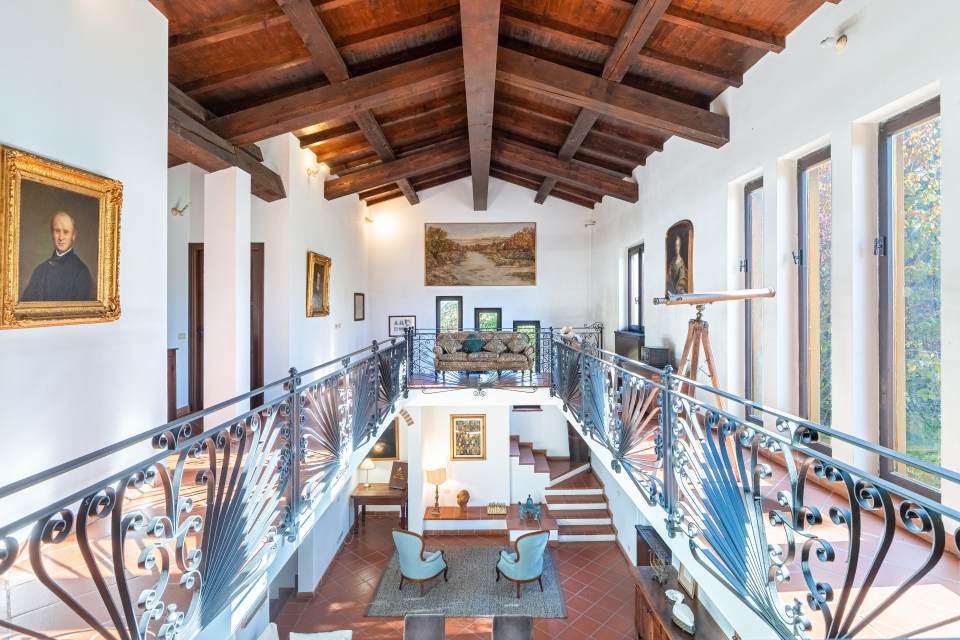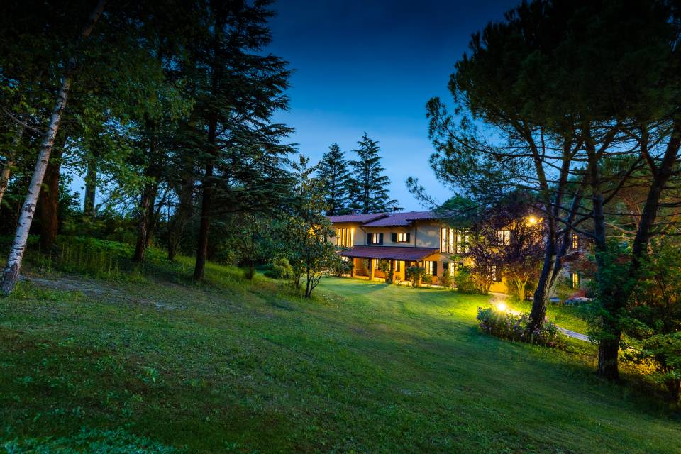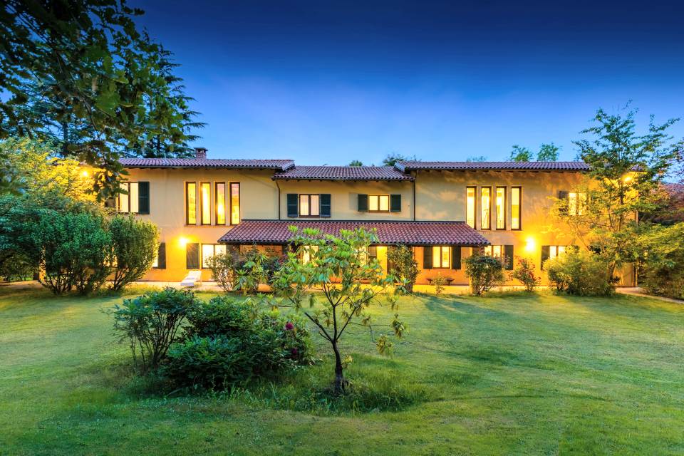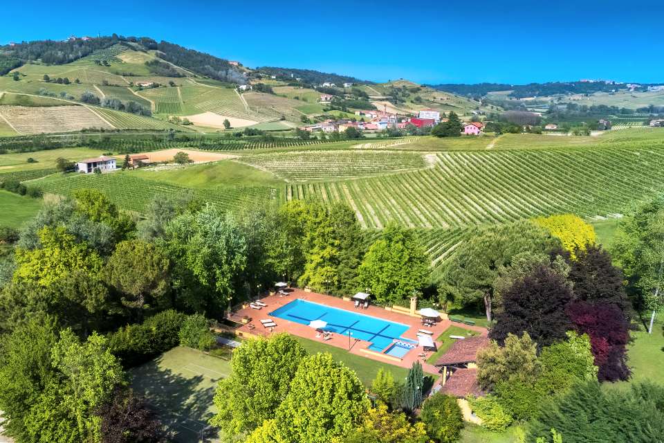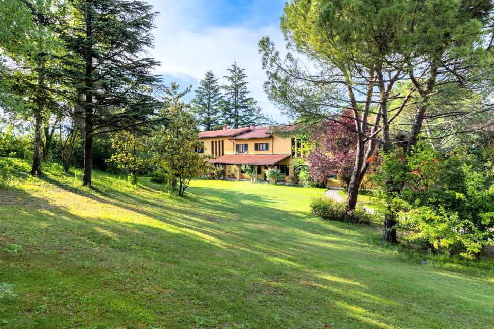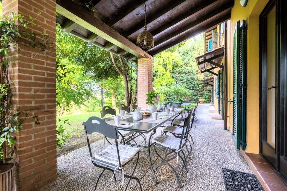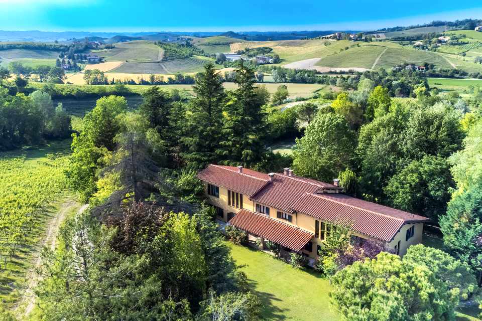 Die grosse und luxuriöse Landvilla mit ihren schattenspendenen Porticos und der sie umgebene Park geniesst eine wunderbare Hanglage mit unverbaubarem Panoramablick auf die UNESCO-Weinlandschaft des Monferrato.