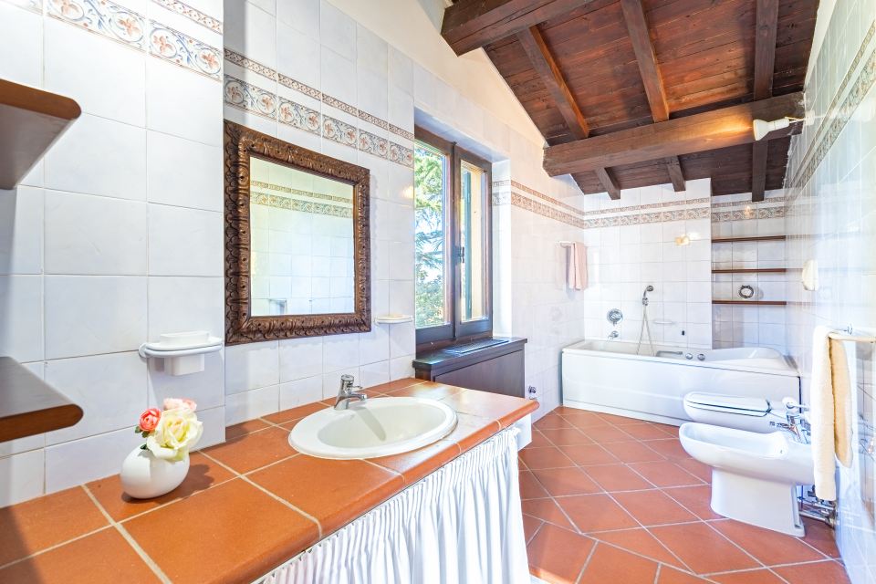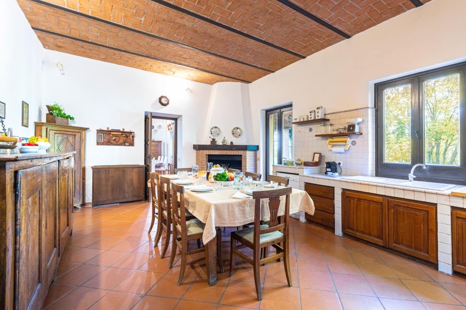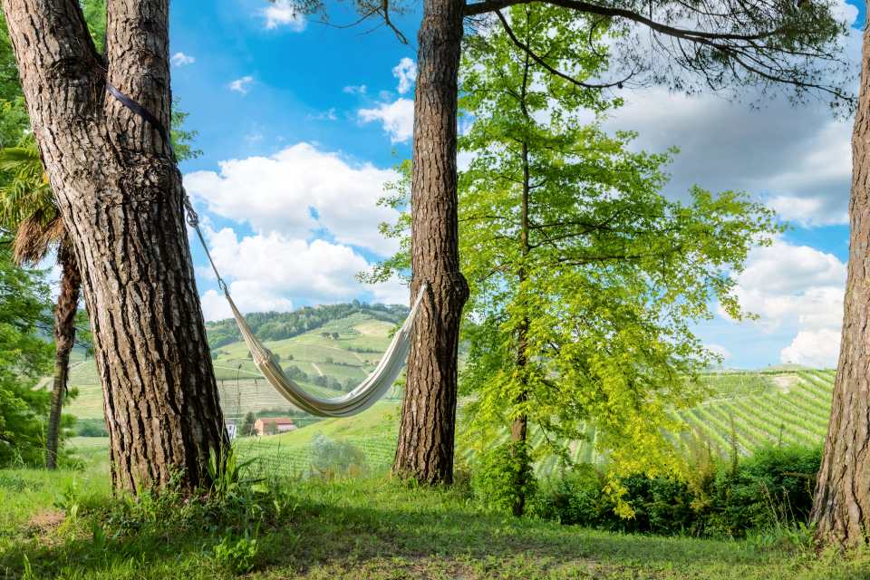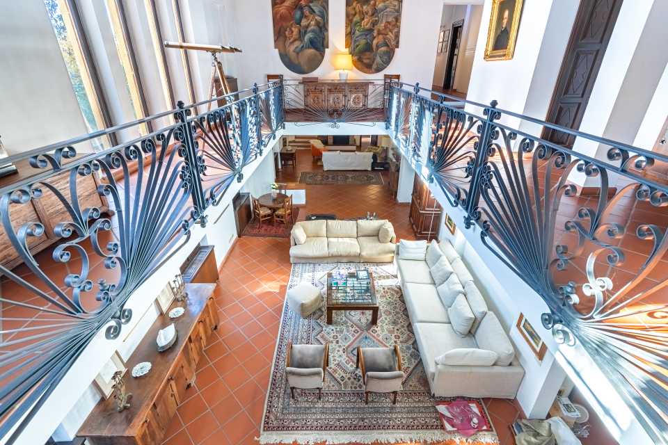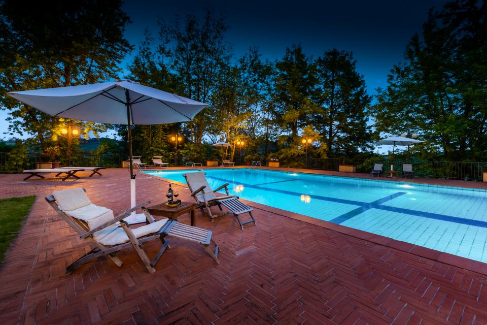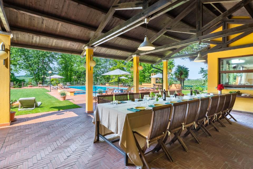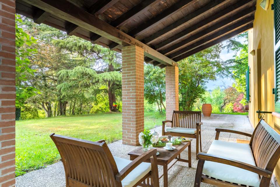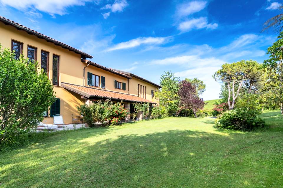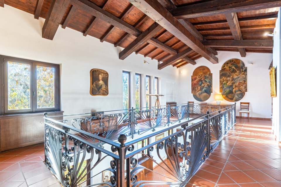 Die grosse und luxuriöse Landvilla mit ihren schattenspendenen Porticos und der sie umgebene Park geniesst eine wunderbare Hanglage mit unverbaubarem Panoramablick auf die UNESCO-Weinlandschaft des Monferrato.