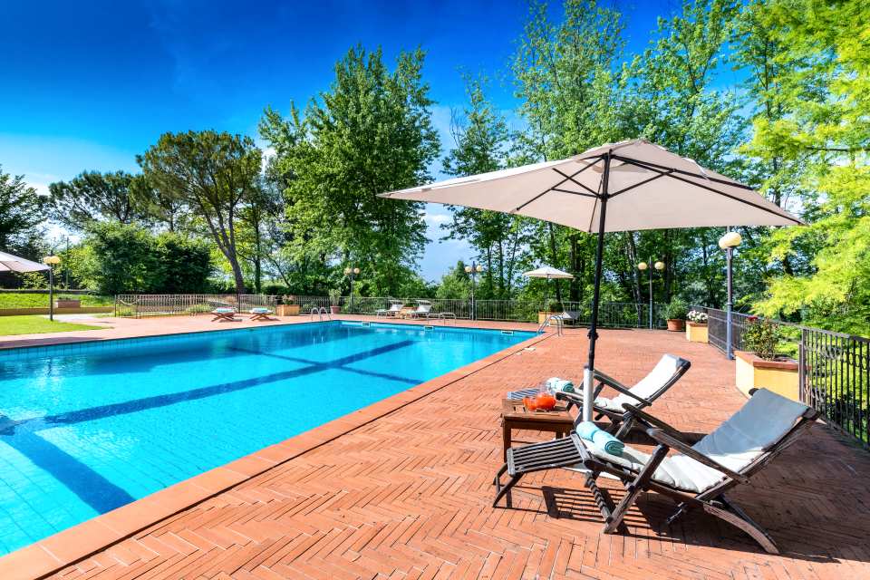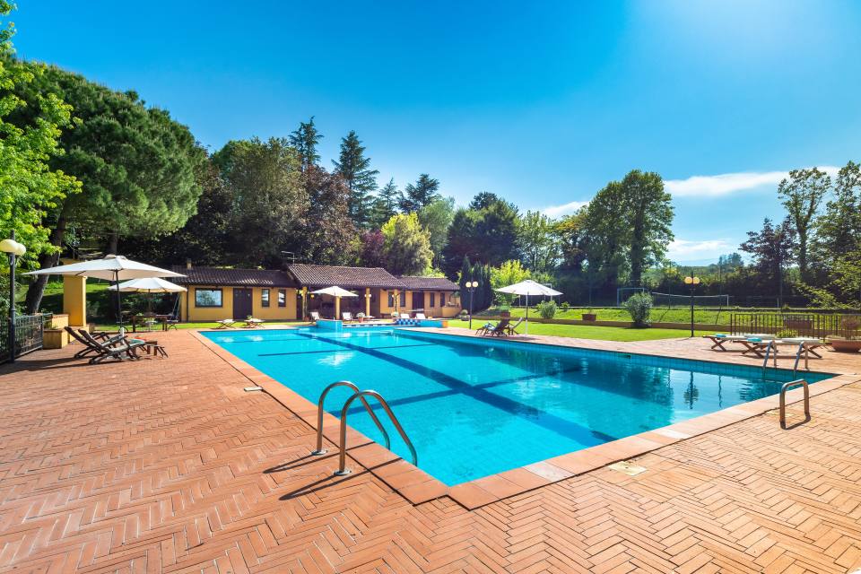 Herzstück des Parks ist die eindrucksvolle Poolanlage: Der geflieste Pool misst 22 x 10 m und hat eine Tiefe zwischen 1,30 und 3,50 m. Es gibt auch einen flachen Bereich für Kinder und weniger erfahrene Schwimmer. Umgeben ist der Pool von einer grossen Sonnenterrasse, die mit Liegestühlen und Sonnenschirmen bestückt ist. Das angrenzende Poolhaus verfügt über eine gut ausgestattete Küche mit Zugang zur überdachten Terrasse mit dem grossen Essplatz und es gibt Umkleidekabinen, ein Bad, eine Sauna und eine Aussendusche.