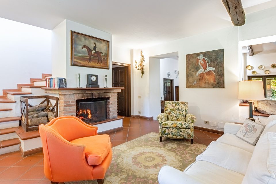 Im ersten Stock befinden sich in der ausgebauten Mansarde ein weiterer, attraktiver Wohnraum mit offenem Kamin und Zugang zu Schlafzimmer 6, mit Bad und separater Ankleide.