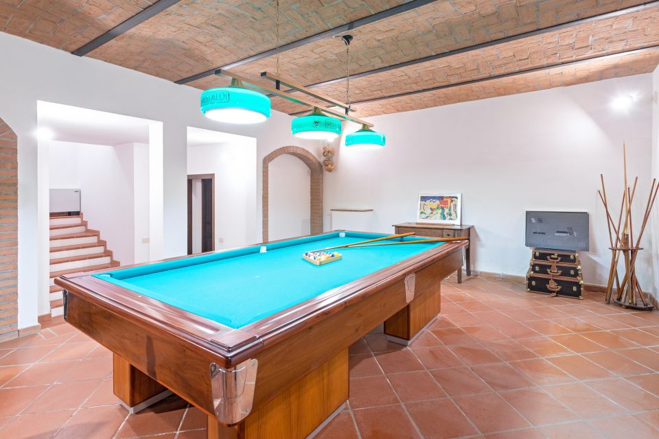 Über eine Innentreppe gelangt man vom Erdgeschoss ins Untergeschoss und in den Keller: Hier befinden sich ein Partyraum mit einem Billardtisch, ein Lagerraum für den Wein und ein Gäste WC.
