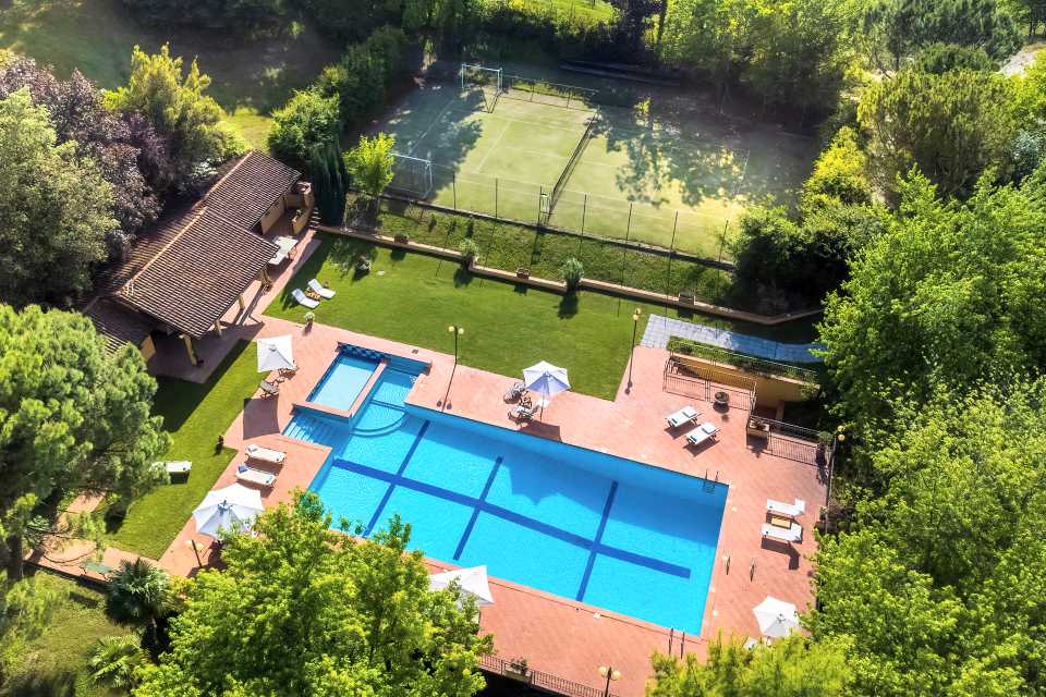 Umgeben ist die Villa von einem sehr gepflegten, zum Grossteil eingezäunten Grundstück und einem Park mit vielen schattenspendenden, alten Bäumen und grünen Rasenflächen. Ein Highlight ist die eindrucksvolle Poolanlage mit einem grossen Poolhaus und einem Tennisplatz im Anschluss.