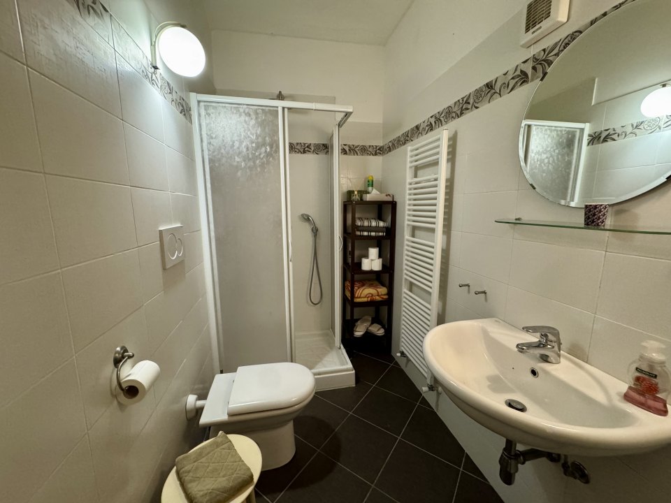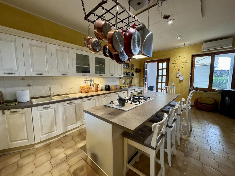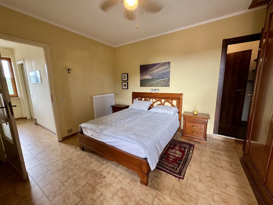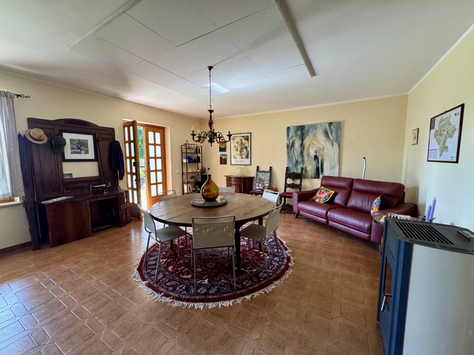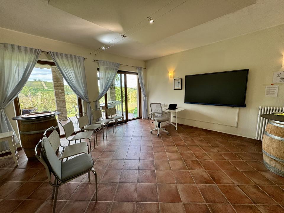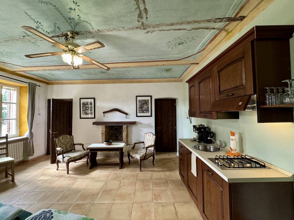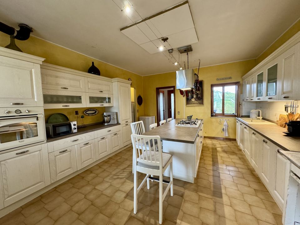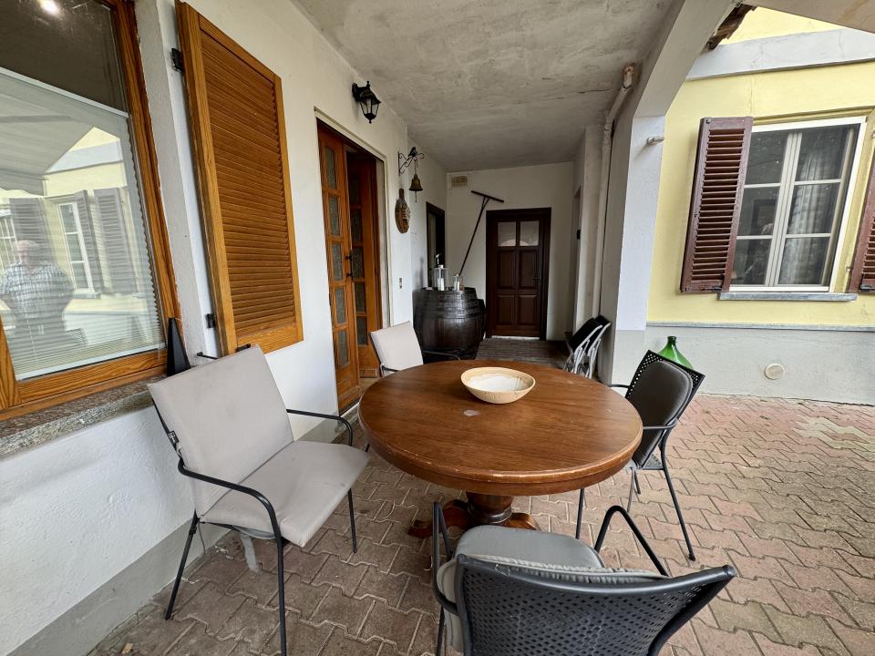 Vom Vorplatz betreten Sie das Haus durch den Haupteingang und gelangen direkt in den großen, offenen Wohn-Essraum – das Herz des Hauses. Hier steht ein gemütlicher Kaminofen, der an kühleren Abenden für wohlige Wärme sorgt, und von hier führt eine Treppe hinauf zu den Schlafzimmern im ersten Stock. Ein Durchgang führt in die moderne Landhausküche: hell und einladend und mit direktem Zugang zur überdachten Westterrasse und einem Ausgang zur Hofseite. Diese Terrasse ist im Sommer der Lieblingsplatz der Eigentümer – hier wird gegessen und in den Abendstunden die tief stehende Sonne genossen, während der Blick über die grünen Weinhügel des Monferrato schweift. Ebenfalls im Erdgeschoss: ein kleines Gäste-WC gleich neben der Küche und – hinter dem Wohnraum – ein sehr großer Abstellraum mit Zugang zur anschließenden Garage und zu einem antiken, unterirdischen Weinkeller.