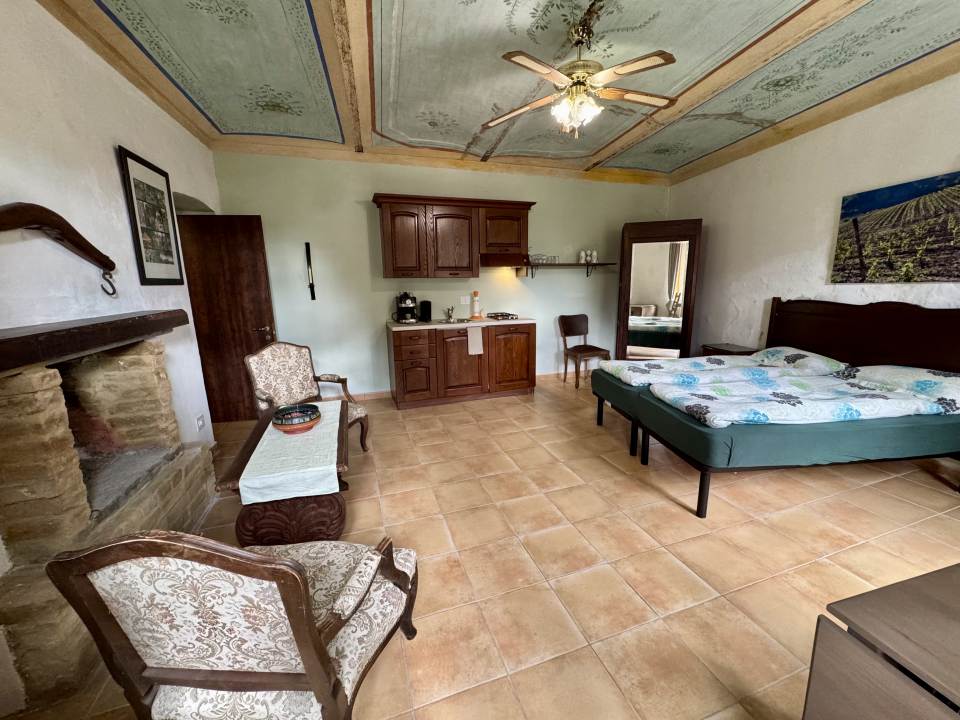 Rechts liegt die gemütliche Einzimmerwohnung: ein großer Wohn-Schlafraum mit offenem Kamin, kleiner, gut ausgestatteter Küchenzeile (Herd, Kühlschrank, Spüle) sowie einem praktischen Duschbad – perfekt für Gäste oder Familienmitglieder.