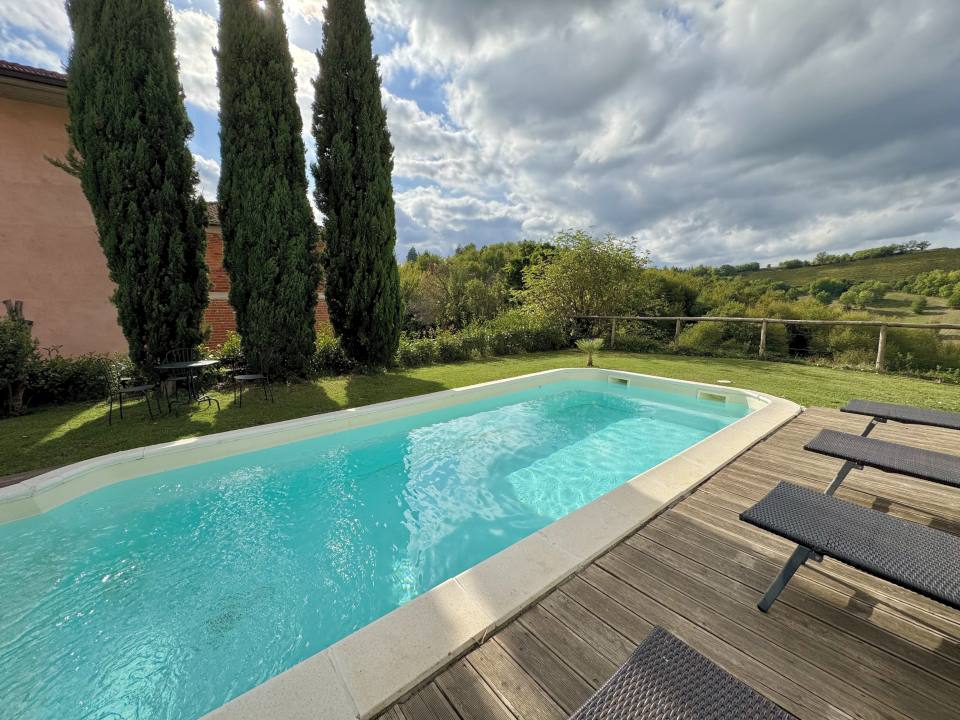 Auf der Südseite des Hauses befindet sich der Swimmingpool (8 × 4 m mit römischem Einstieg) mit einer Sonnenterrasse, bestückt mit Liegen und Sonnenschirmen und der Blick nach Westen ist frei über die nahen Weinhügel.