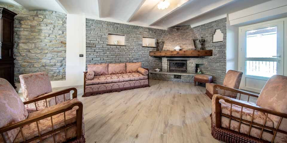 Von der Rückseite des Hauses, wo sich ein grosser Parkplatz befindet, führt die Eingangstür in den Rezeptions- und Empfangbereich. Für alle Bewohner zugänglich sind im Erdgeschoss der Tagesbereich. Dieser besteht aus einem grossen Wohnraum mit einem offenen Kamin und Zugang auf die überdachte Terrasse, einer Küche mit einem Pizza-Ofen, einem Fitnessraum mit Bad, einem Abstellraum und einem Gäste-WC.