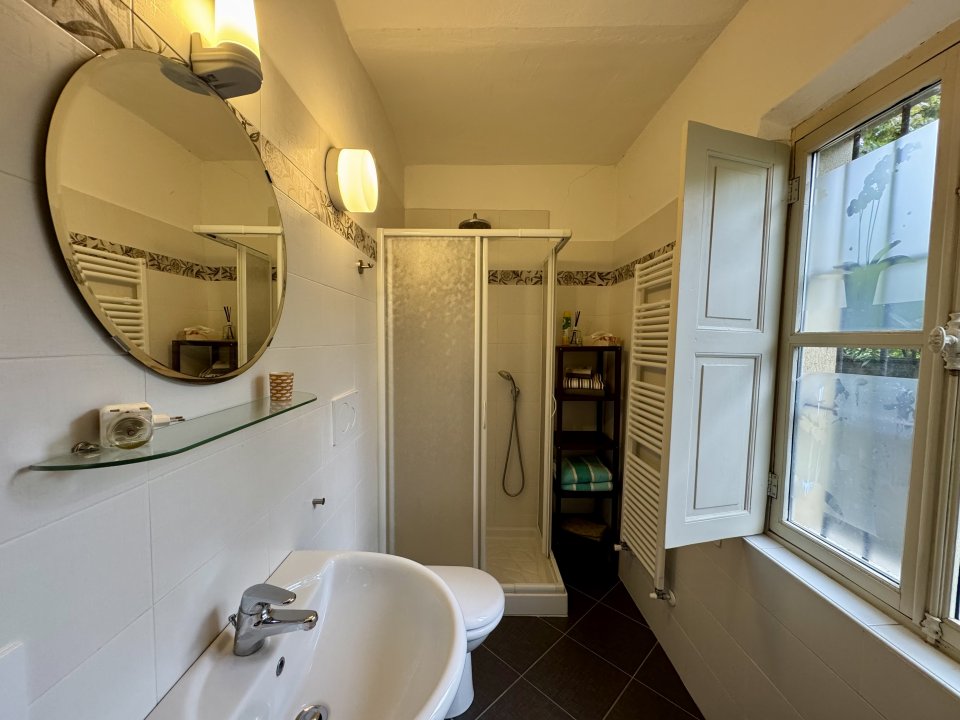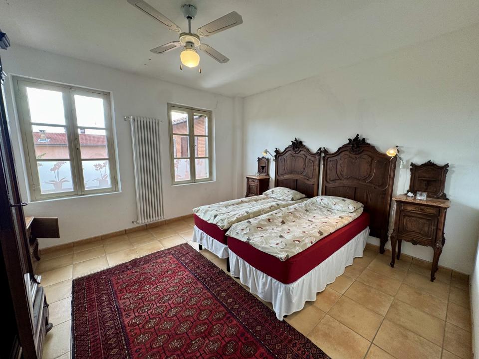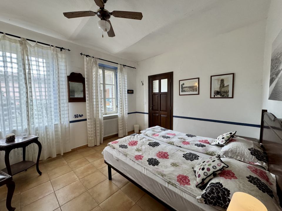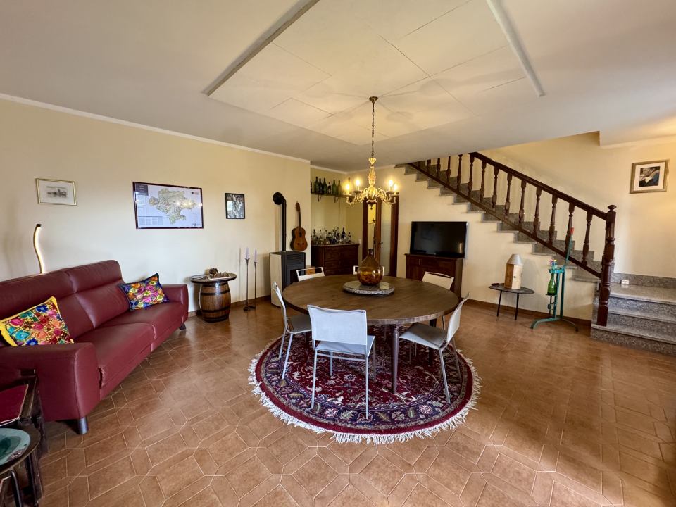 Vom Vorplatz betreten Sie das Haus durch den Haupteingang und gelangen direkt in den großen, offenen Wohn-Essraum – das Herz des Hauses. Hier steht ein gemütlicher Kaminofen, der an kühleren Abenden für wohlige Wärme sorgt, und von hier führt eine Treppe hinauf zu den Schlafzimmern im ersten Stock. Ein Durchgang führt in die moderne Landhausküche: hell und einladend und mit direktem Zugang zur überdachten Westterrasse und einem Ausgang zur Hofseite. Diese Terrasse ist im Sommer der Lieblingsplatz der Eigentümer – hier wird gegessen und in den Abendstunden die tief stehende Sonne genossen, während der Blick über die grünen Weinhügel des Monferrato schweift. Ebenfalls im Erdgeschoss: ein kleines Gäste-WC gleich neben der Küche und – hinter dem Wohnraum – ein sehr großer Abstellraum mit Zugang zur anschließenden Garage und zu einem antiken, unterirdischen Weinkeller.