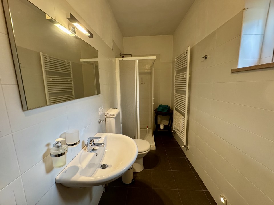 Links befindet sich die grössere Wohnung mit einem geräumigen Wohn-Essraum mit Küchenzeile (Gasherd, Kühlschrank und Spüle) separatem Doppelschlafzimmer und einem Bad mit Dusche, WC und Waschbecken.
