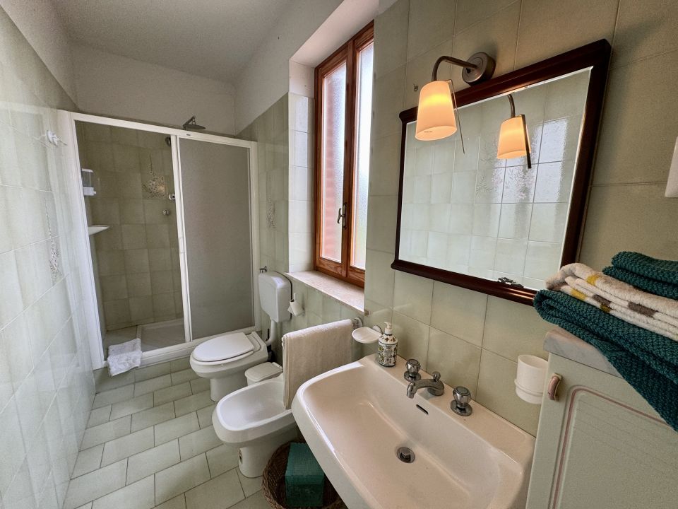 Vom Wohnraum führt eine Treppe in den ersten Stock: hier befinden sich zwei große Schlafzimmer, jeweils mit privatem Bad, ein weiteres Schlafzimmer, ein weiteres Bad, sowie ein kleines Büro/Arbeitsraum und zwei kleinere Terrassen, eine schaut nach Süden und eine nach Westen.