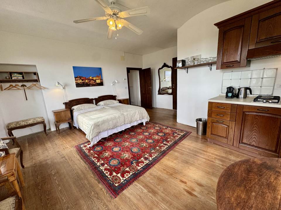 Rechts liegt die gemütliche Einzimmerwohnung: ein großer Wohn-Schlafraum mit offenem Kamin, kleiner, gut ausgestatteter Küchenzeile (Herd, Kühlschrank, Spüle) sowie einem praktischen Duschbad – perfekt für Gäste oder Familienmitglieder.